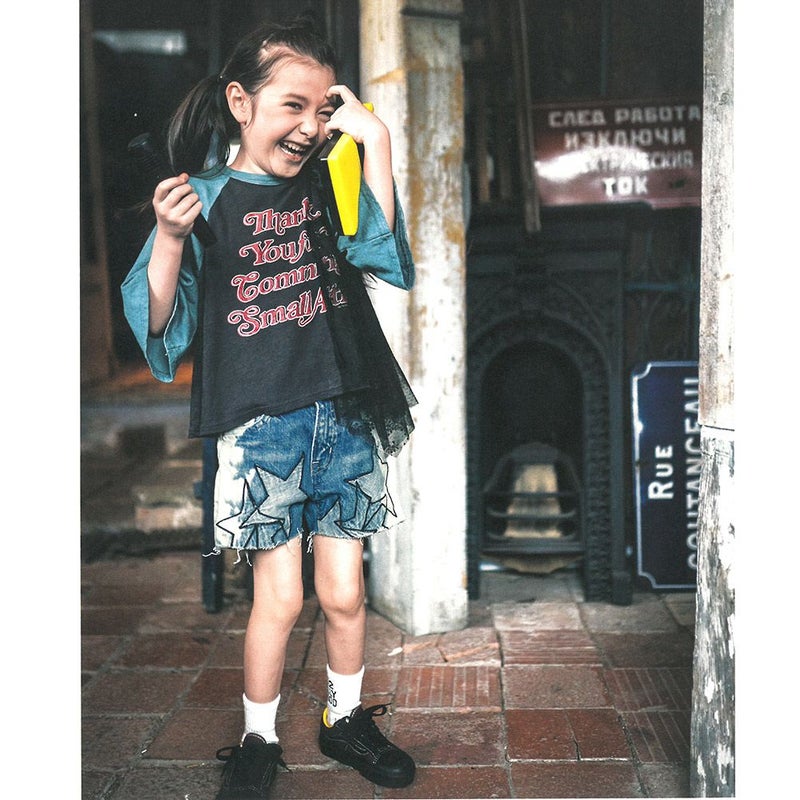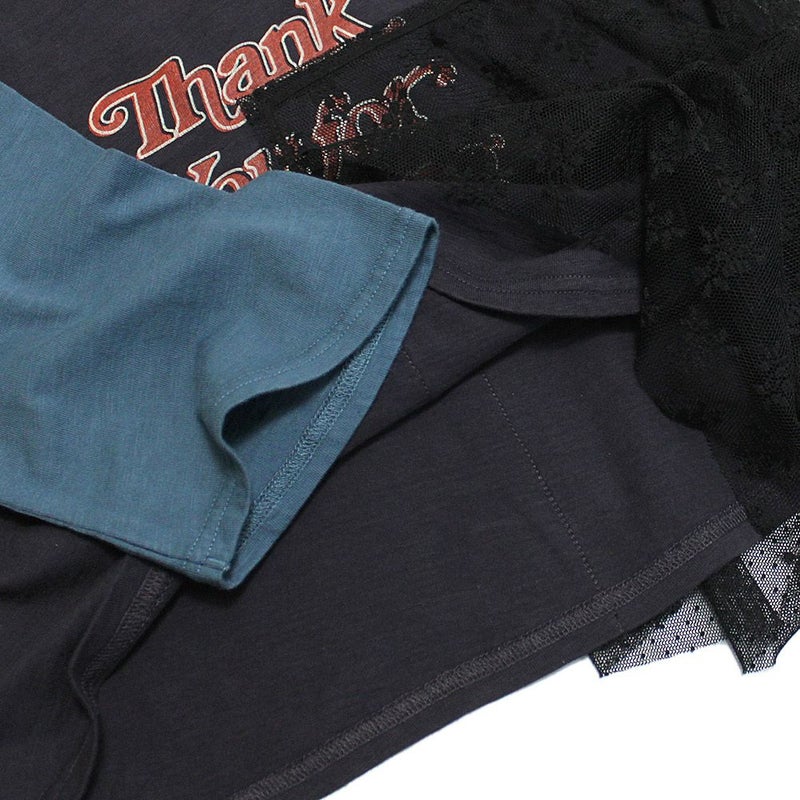 バンドTのようなプリントとラグラン配色が特徴。