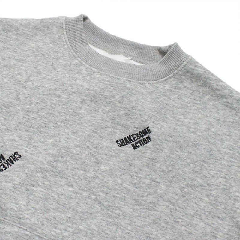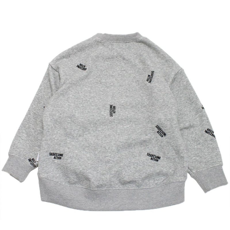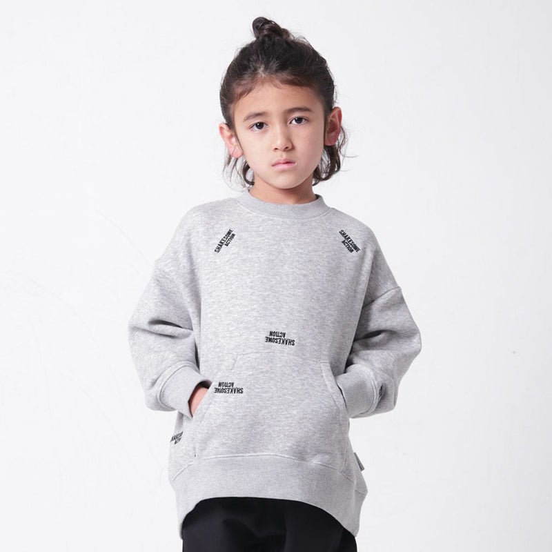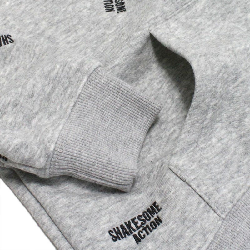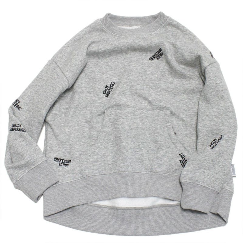 クルーネックにあえてのカンガルーポケットと“SHAK SOME ACTION”の総柄刺繍が絶妙。