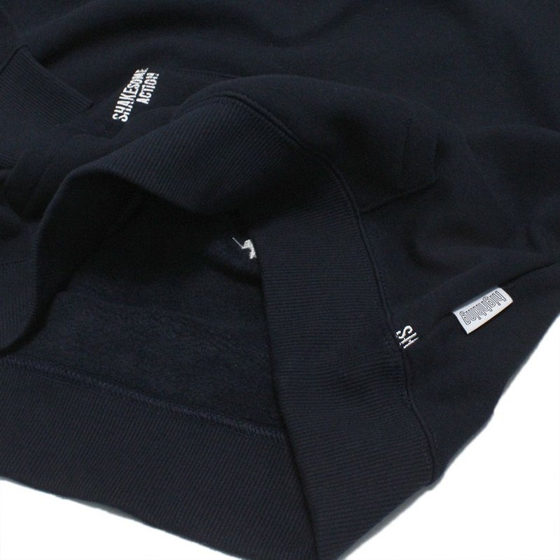 クルーネックにあえてのカンガルーポケットと“SHAK SOME ACTION”の総柄刺繍が絶妙。