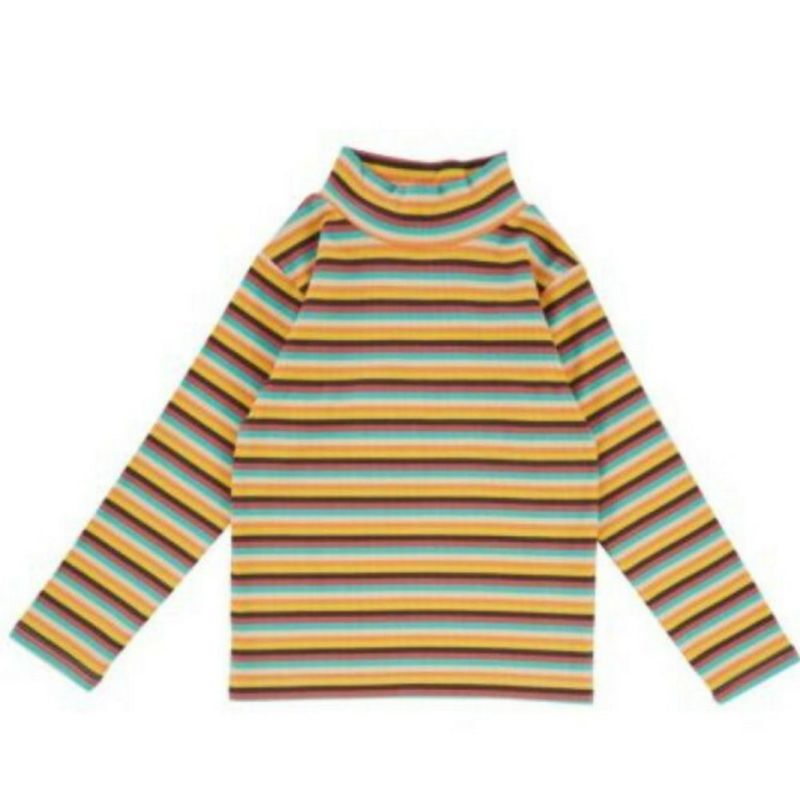 レトロムード漂う配色が目を引く、ボーダータートルネックTシャツ