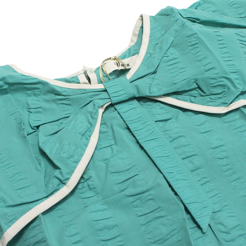 リボンの形の大きな衿が印象的なブラウスです。