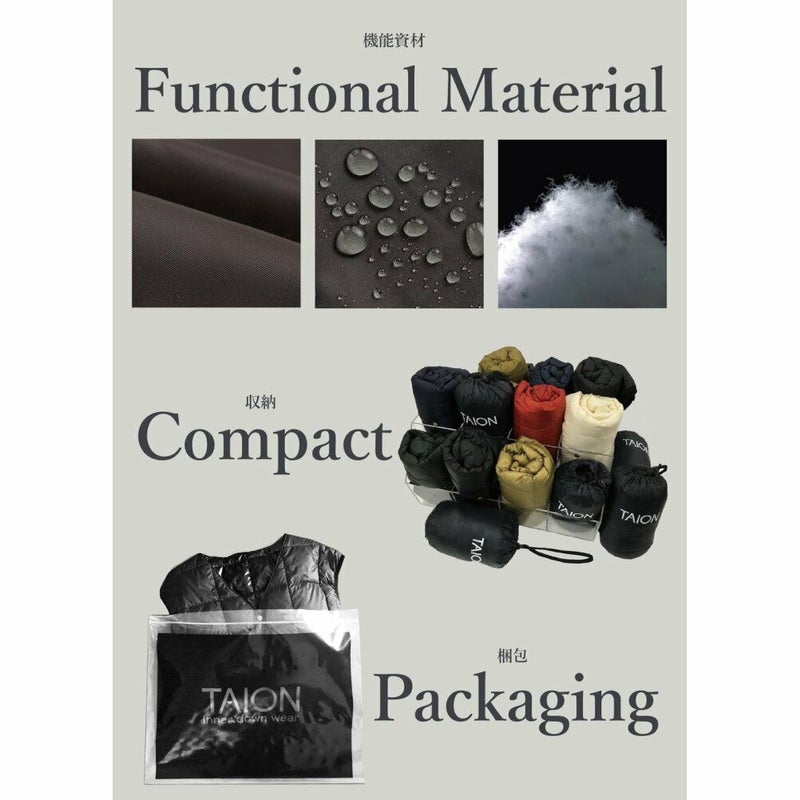「TAION」のブランド名の由来は、TAION=体温。“クオリティーに対する圧倒的コストパフォーマンスを通した価値の追求”をスローガンとし、高品質で高機能なインナーダウンを幅広く展開しています。 色やサイズの豊富なバリエーションもTAIONインナーダウンの特徴です。