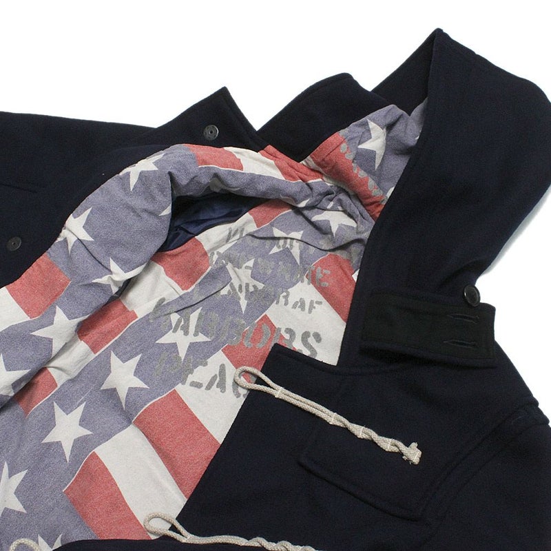 裏地はオリジナルの星条旗柄を粗野感残るシーチングにプリント。