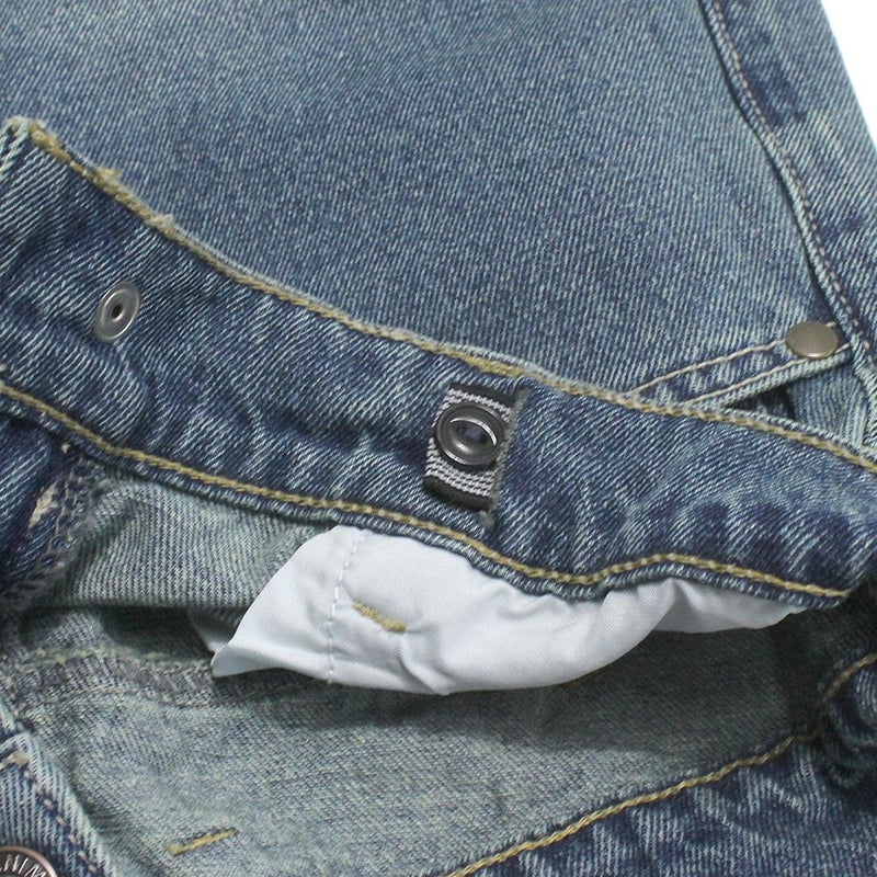 デニム地の独特な表情がポイントの前明き仕様のデニムパンツ。