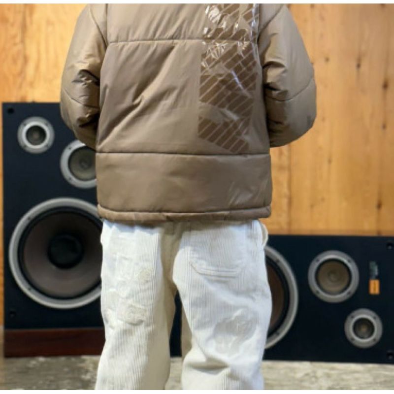 前後左右に身生地と同色系で施したグラフィティロゴ刺繍がポイント。