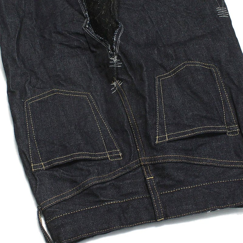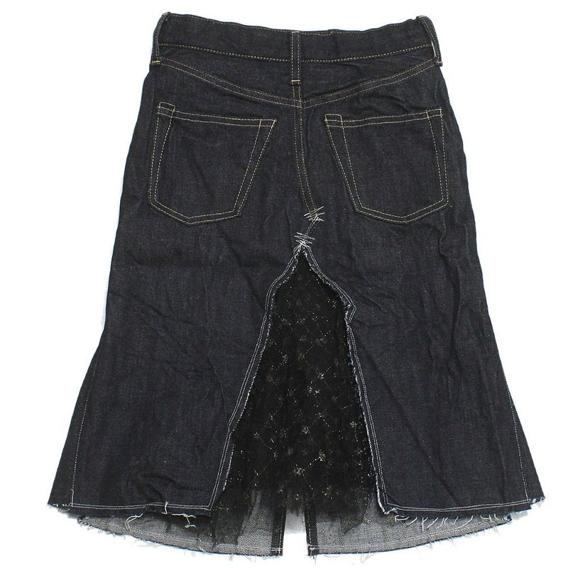 セルビッチ付きの5ポケットデニムを膝下丈のスカートにリメイクしたようなデザイン。