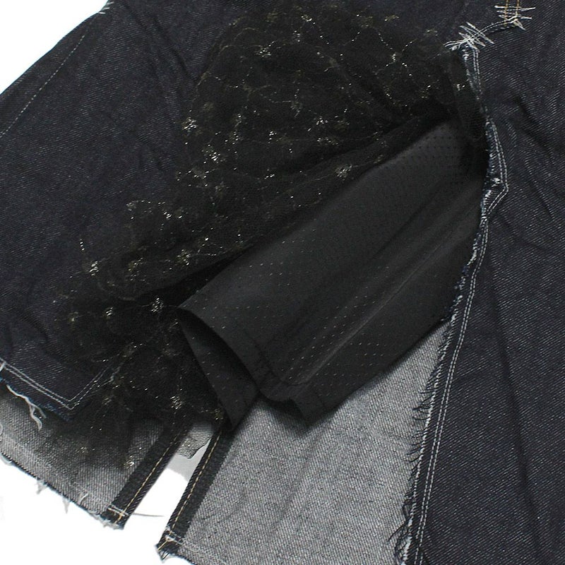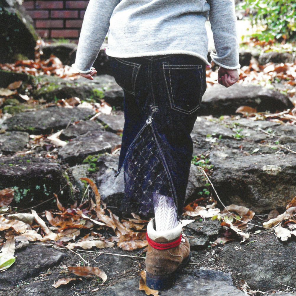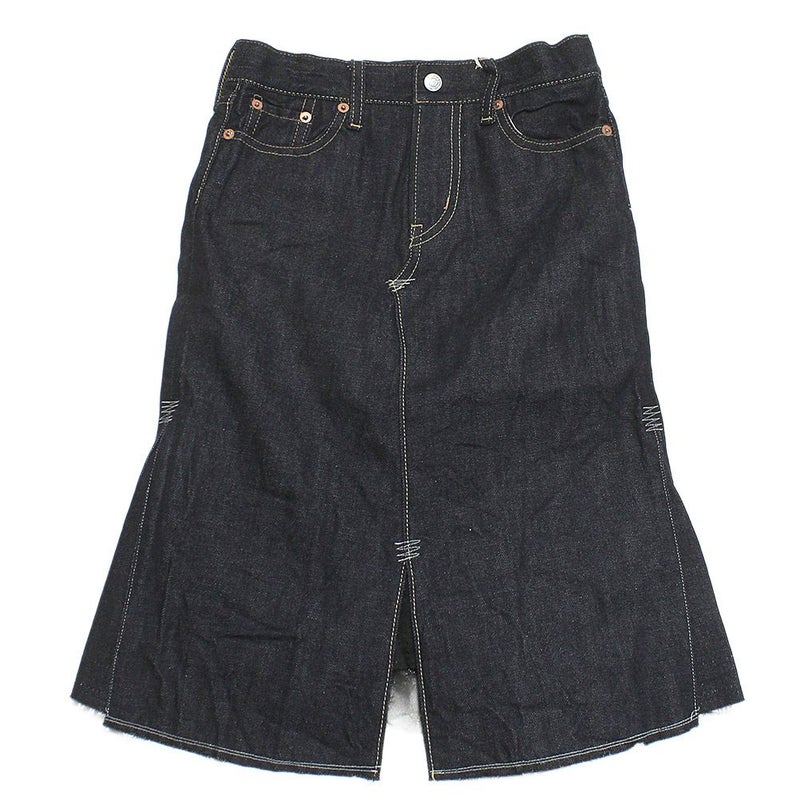 セルビッチ付きの5ポケットデニムを膝下丈のスカートにリメイクしたようなデザイン。