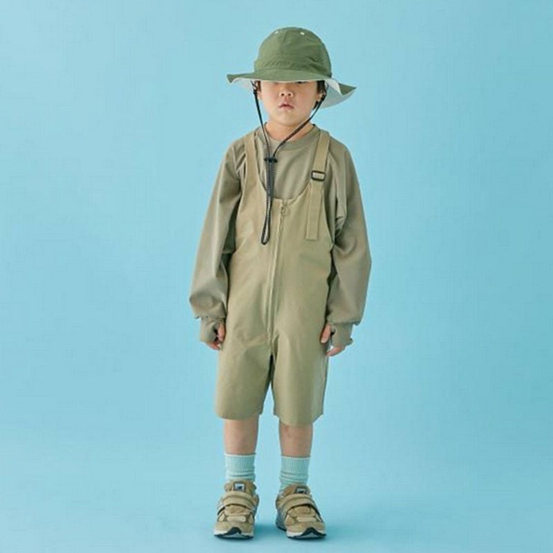 左肩のアジャスターで着丈調節ができるサロペット。