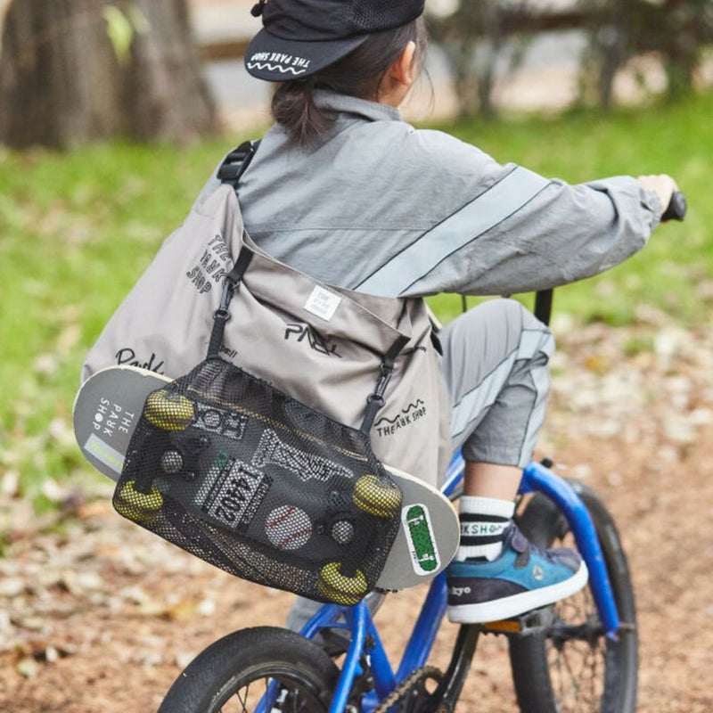ボールやスケボー、ヘルメットなどを外付けできるファスナー付きメッセンジャー。