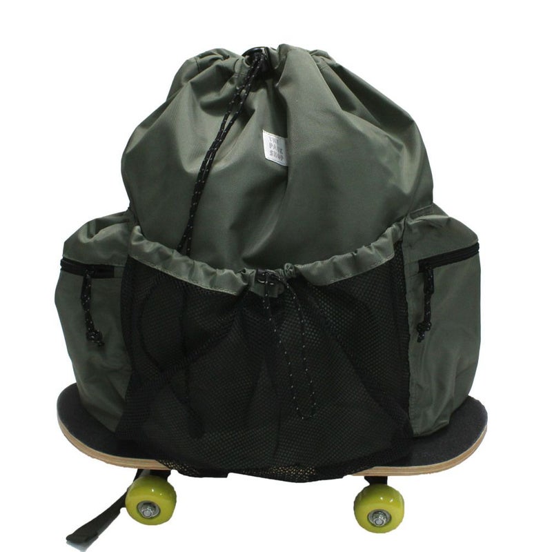 底面のベルクロにスケボーを取り付けてコロコロと引っ張って持ち運び可能です。