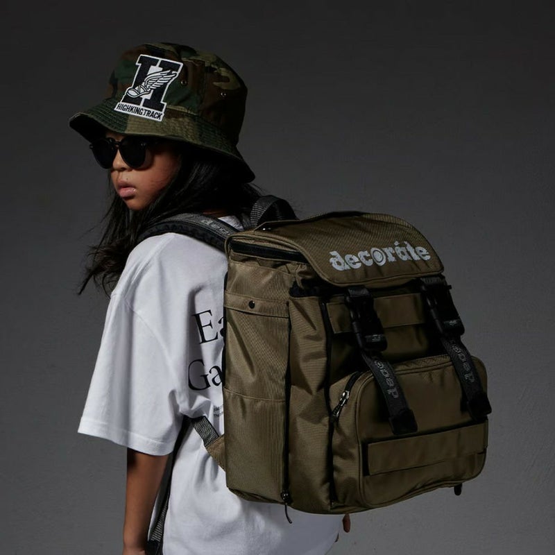 ストリート的なニュアンスのカラーにステンシル風のロゴプリントをプラスした、クールなデザインです。
