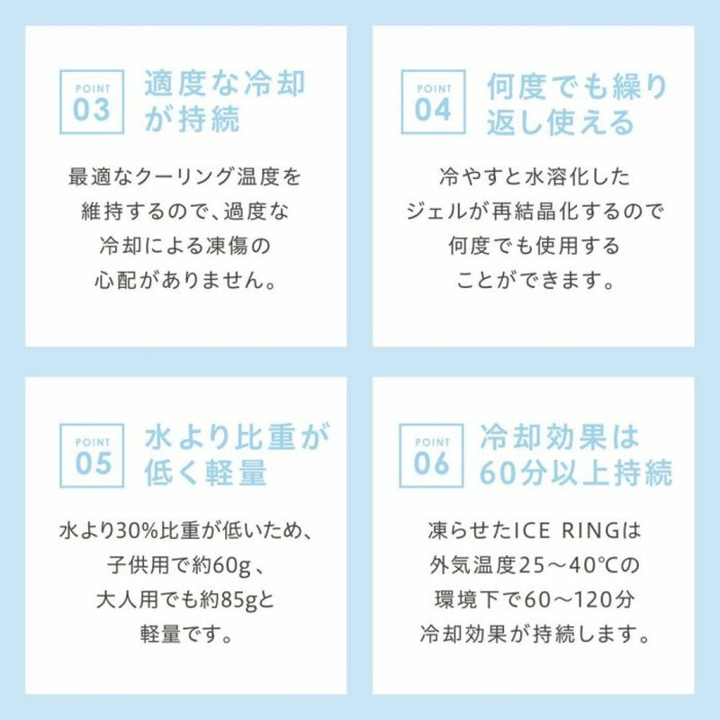首元を冷やすことで、全身の熱をクールダウンさせてくれるICE RING。直接肌につけることで身体の熱を吸収し、心地よくクールダウン。身体にこもった熱を逃がします。