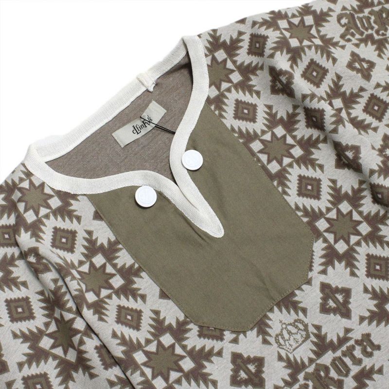 北の王国の民芸(クラフト)のような、八望星エイトスターやダイヤ柄を大胆にデザインした図案を編み上げたオリジナルのコットン天竺のゴムジャガード。