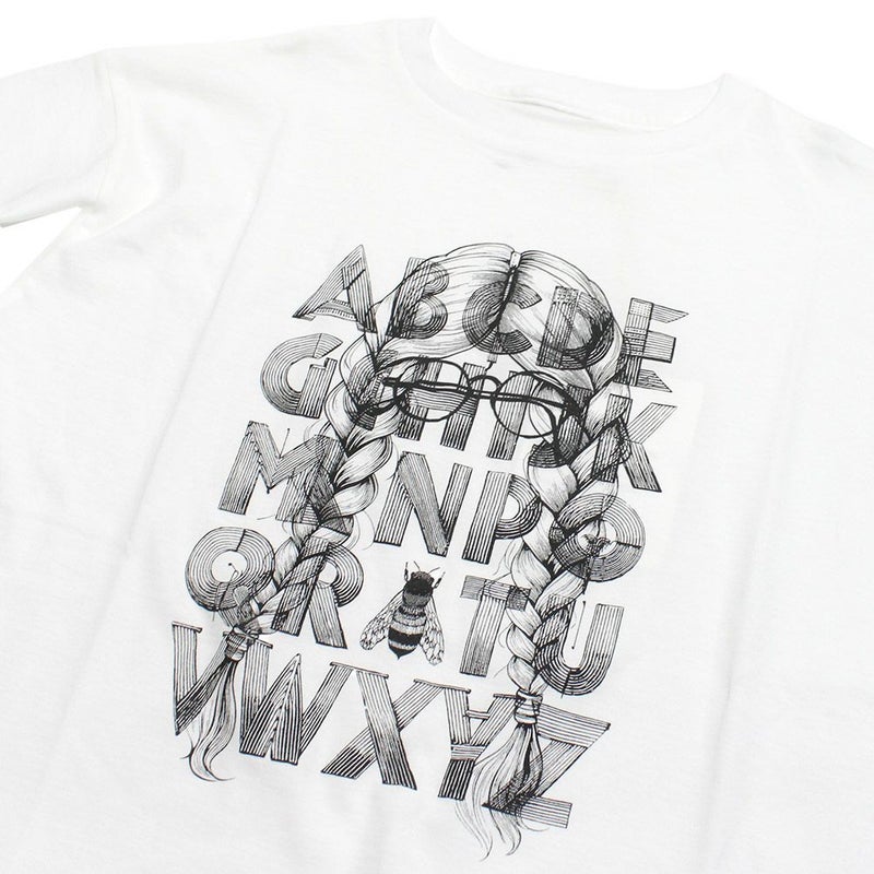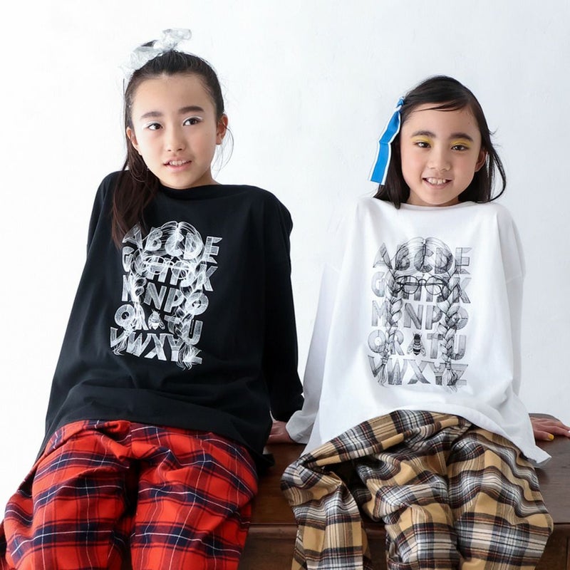 女の子のシルエットにアルファベットを重ねたユニークなデザイン。