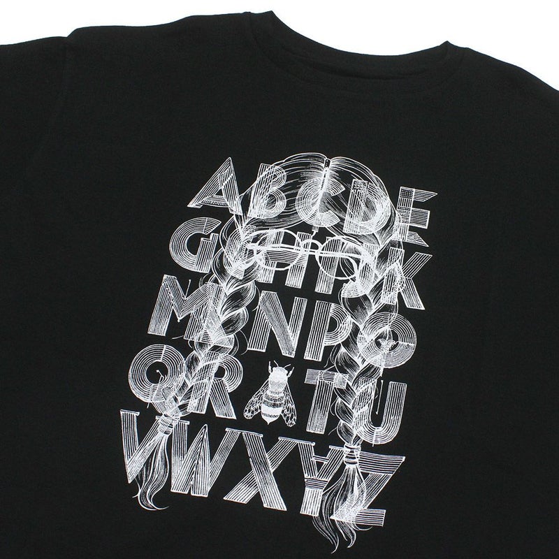 女の子のシルエットにアルファベットを重ねたユニークなデザイン。