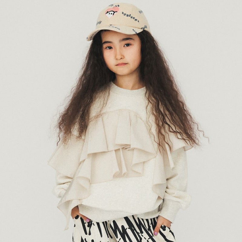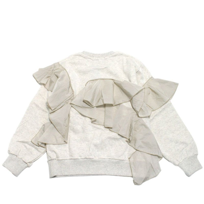 大ぶりのフリルを身頃から袖に付けたトレーナー。