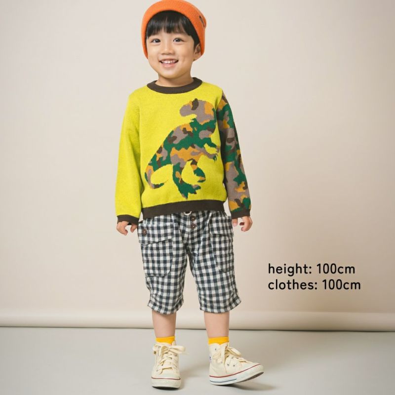 身頃に大胆な恐竜モチーフ、袖には迷彩柄を組み合わせた遊び心あふれるニットプルオーバーです。