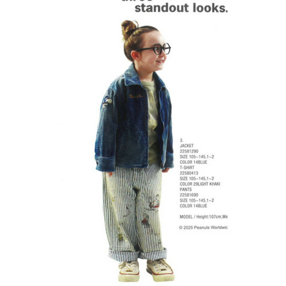 スヌーピーと仲間たちが散りばめられたダブルニーパンツ。