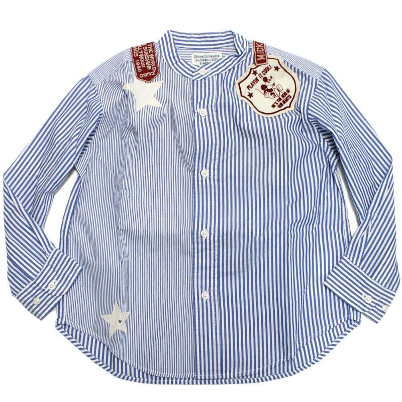 スタンドカラーのシンプルなシャツにミッキーや星のアップリケワッペンを襟元に施したリメイクデザイン。