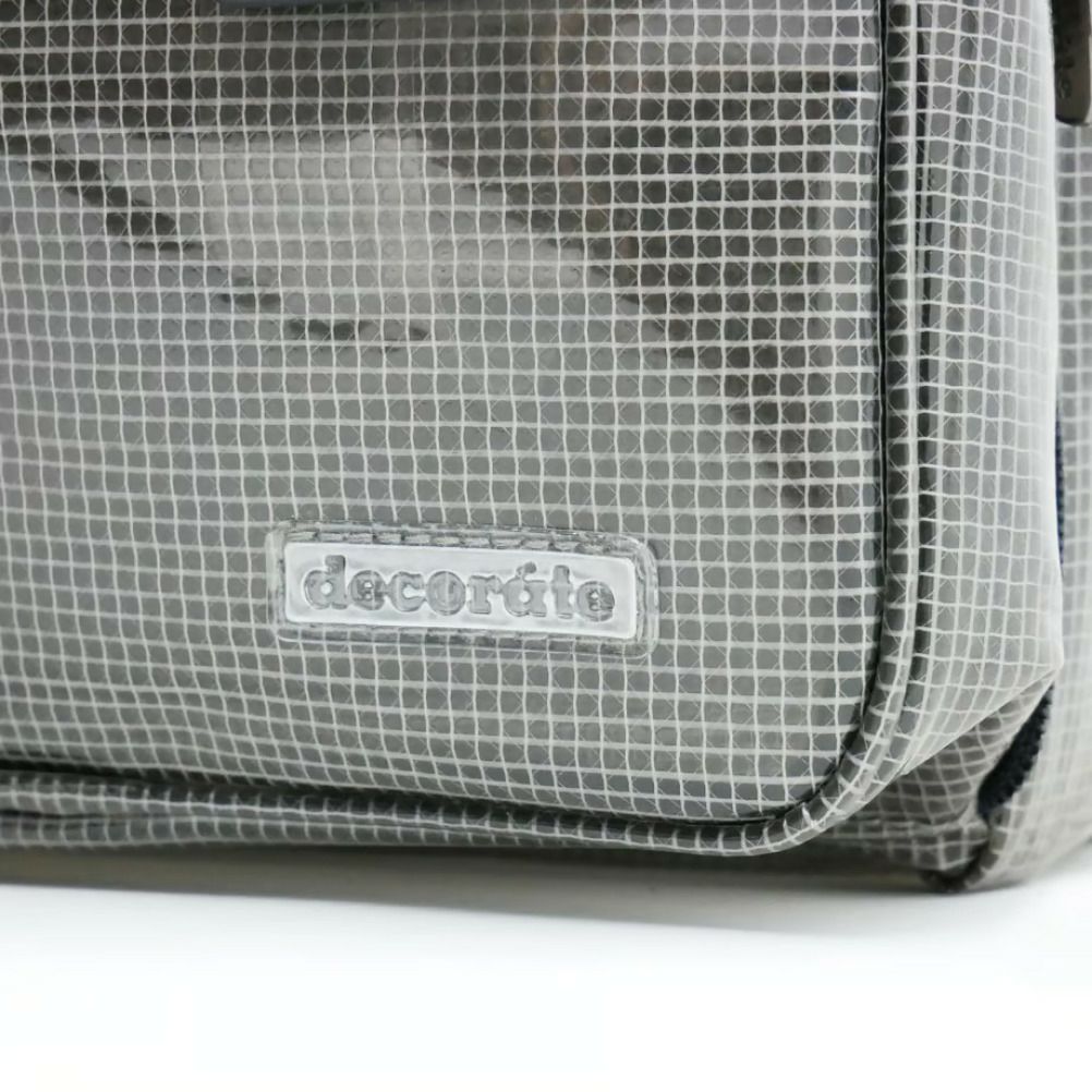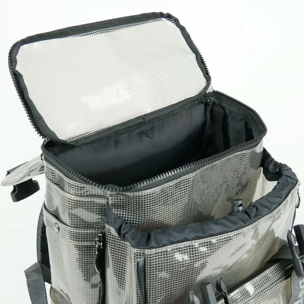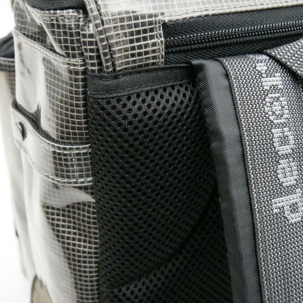 素材の特性をそのまま活かして、メインフラップ、サブコンパートメント、外側のファスナー付きポケットをハーフスケルトンで仕上げた個性派デザイン。
