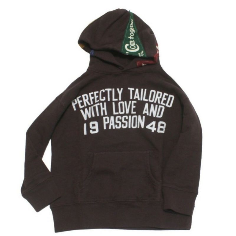 フード周りにお気に入りのペナントを付けたリメイク風パーカーです。