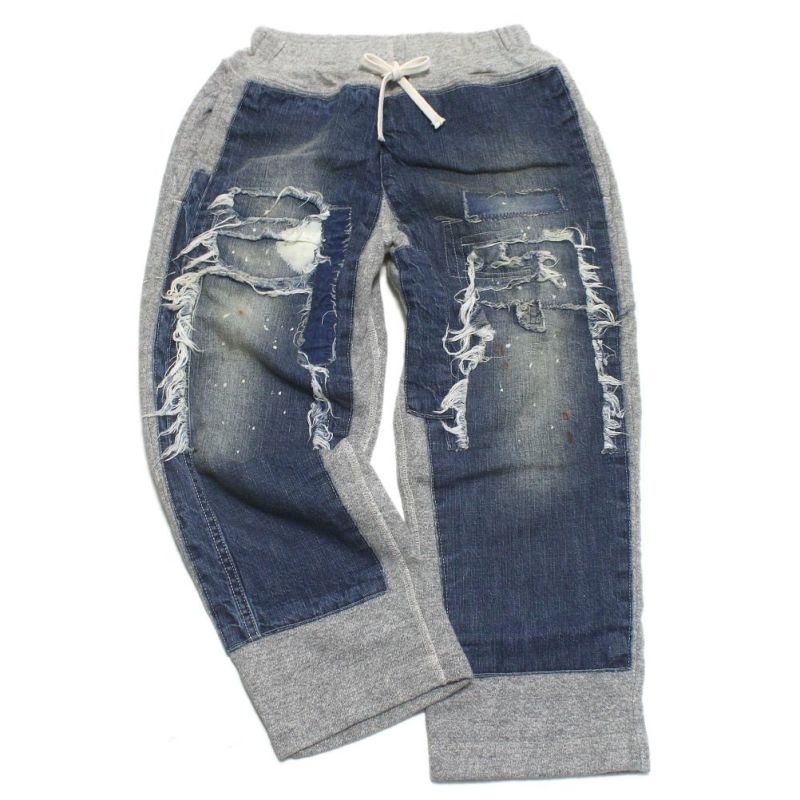 本格的なダメージ加工を施したデニムと、スウェットパンツをドッキング。