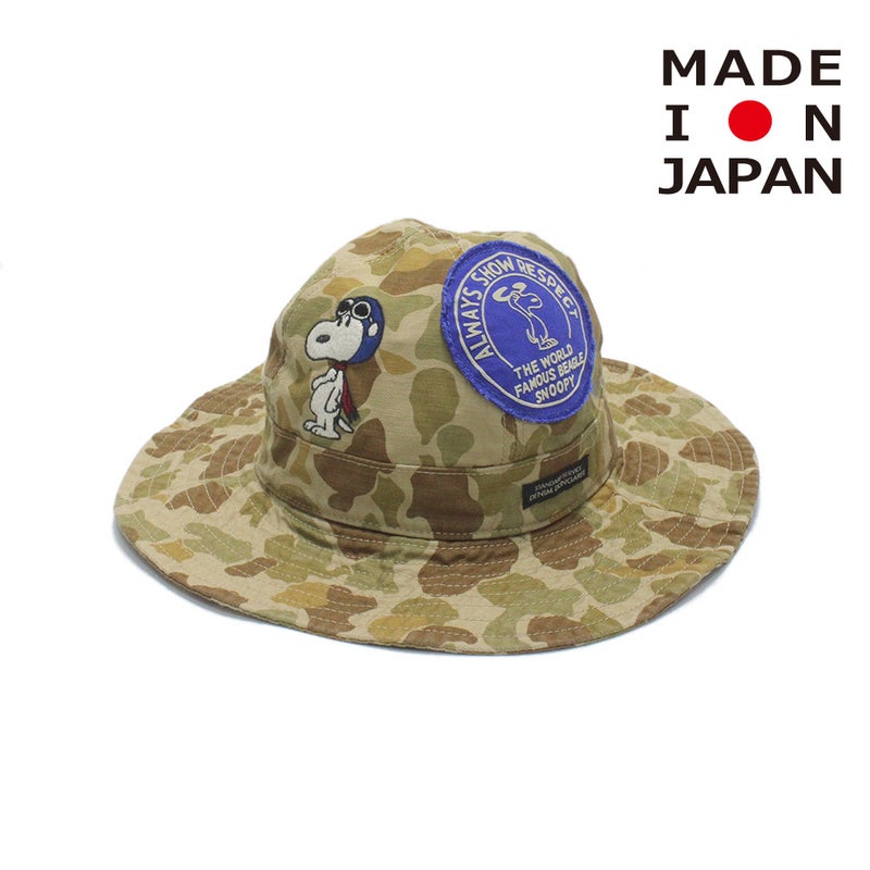 手振りミシンの雰囲気のスヌーピー刺繍と、ワッペンが全体に入ったコラボハット。