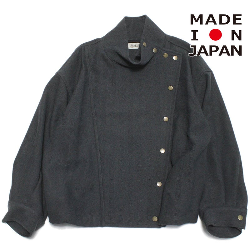 アシンメトリーなフロントデザインのハイネックジャケット。