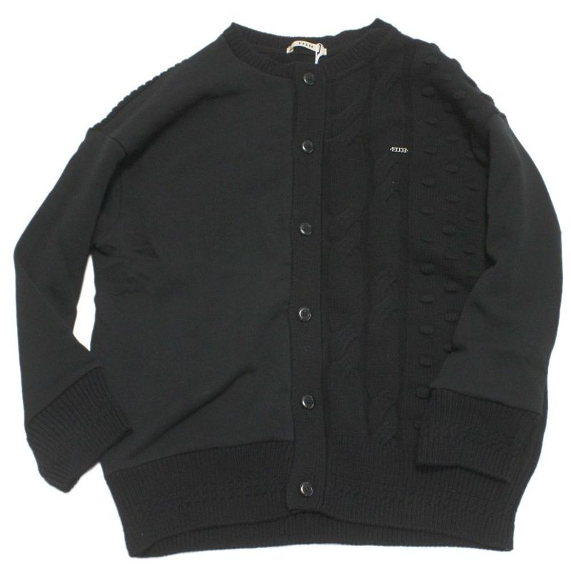 存在感抜群の縄編み・畔編み・ドット柄の3柄と裏毛を組み合わせた丸首カーディガンです。