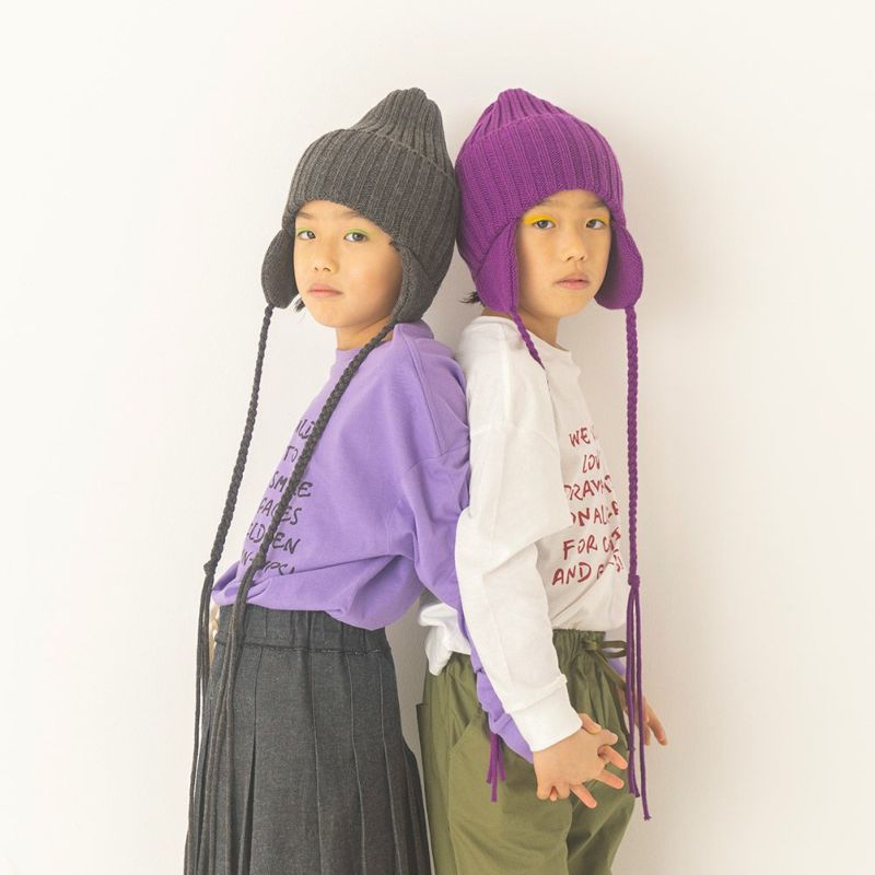 伸縮性があり柔らかく、軽い糸で編まれた耳当て付きニット帽。