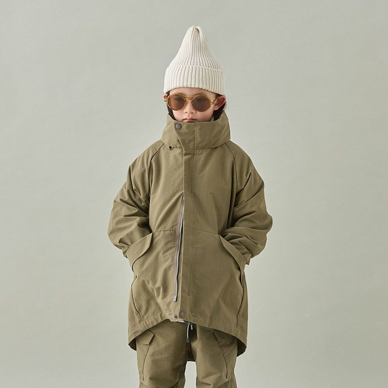 ミリタリーテイストの一重仕立てのハーフコート。