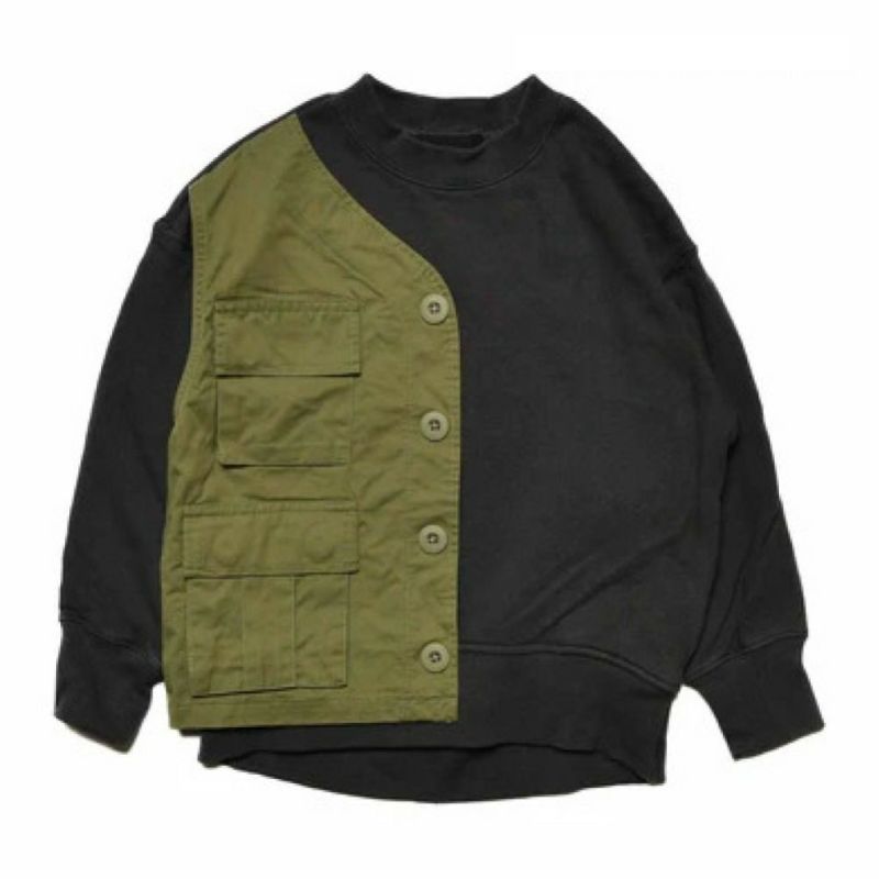 トレーナーにベストを縫い付けたようなリメイク風のデザイン。