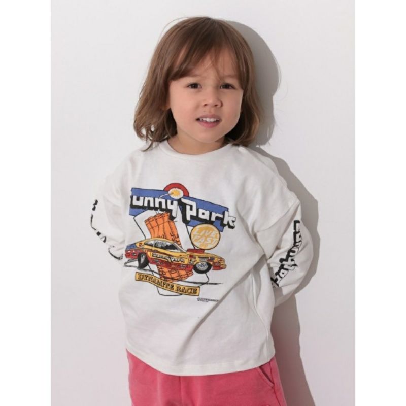 ポップなカラーでレーシングカーをプリントした長袖Tシャツ。