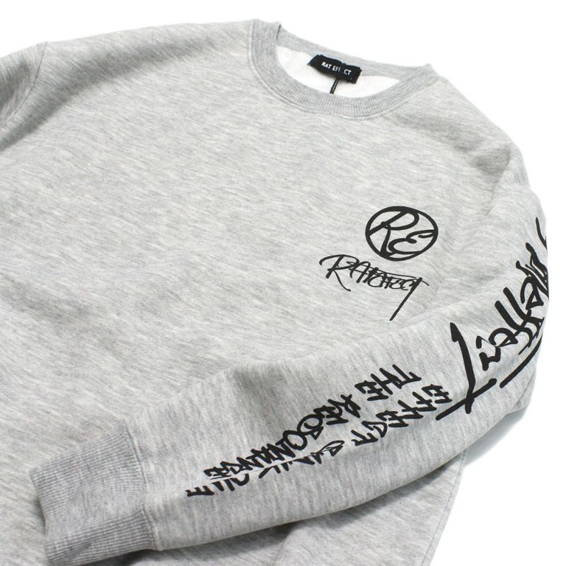 左袖とバックに大胆なプリントを施した、存在感抜群の裏起毛トレーナー。