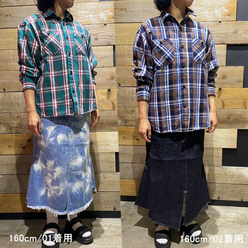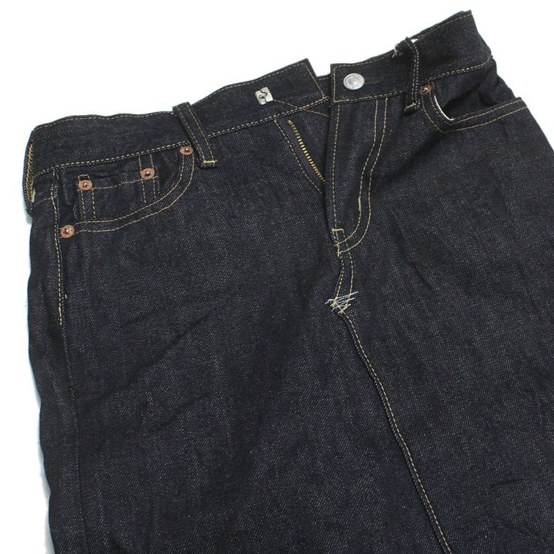 セルビッチ付きの5ポケットデニムを膝下丈のスカートにリメイクしたようなデザイン。