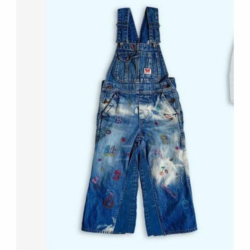 44LBLはブリーチ加工のデニムの上から、動物や掃除道具といった日常のモチーフをカラフルに刺しゅうしたオーバーオール。