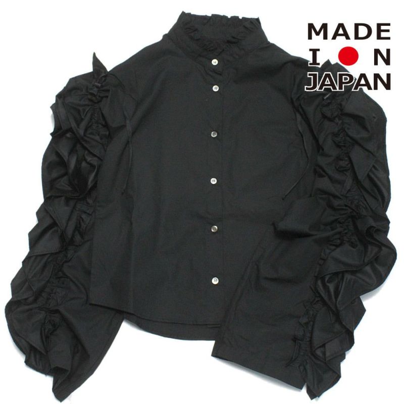 襟とスリーブにボリュームたっぷりのフリルをあしらったブラウス。