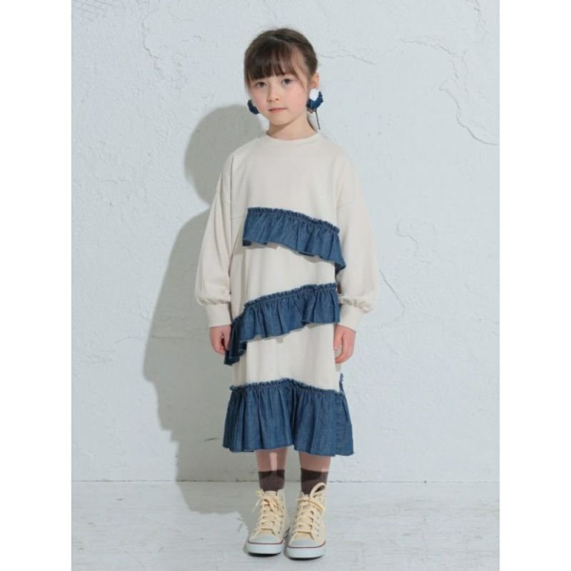 大胆に切り替えられたデニムフリルデザインが映える膝下丈のドッキングワンピース。