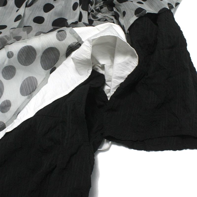 大きさの異なるドットをランダムに散らした生地を肩からサイドへ