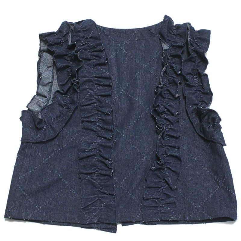 針抜きデニム生地が個性的なフリルベストです。