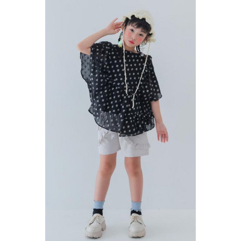 アルファベットが散りばめられた個性的なオーガンジー生地をたっぷりと使用したブラウス。