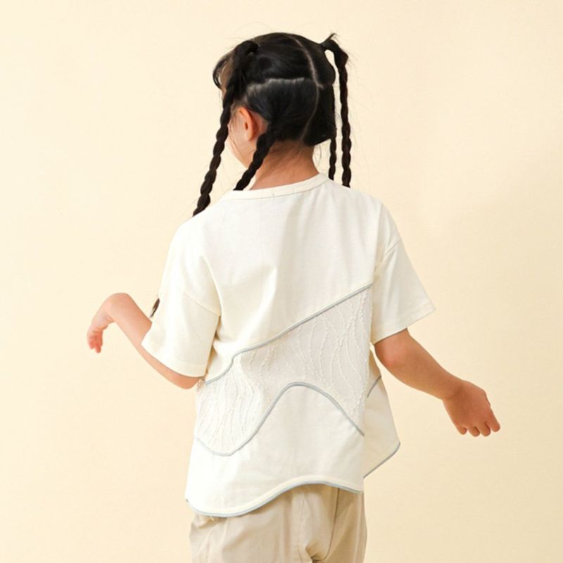 軽い天竺生地をベースに、切替部分には波打ち際のような柄の生地を使うことで爽やかな印象に。