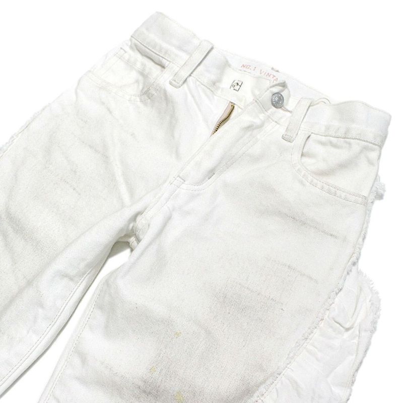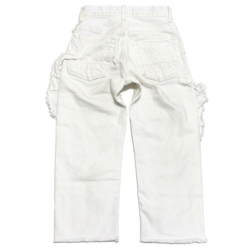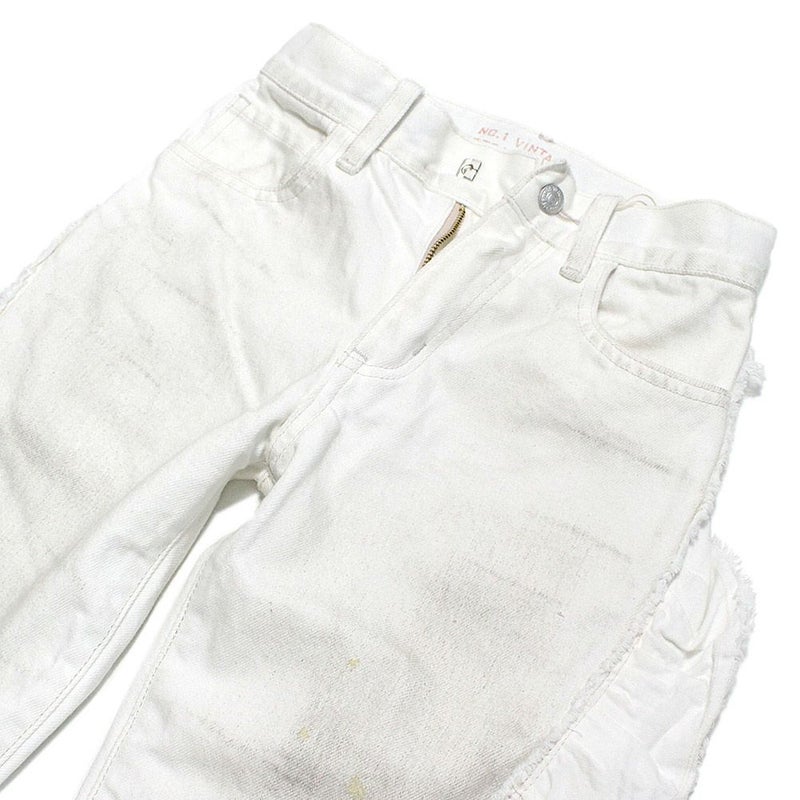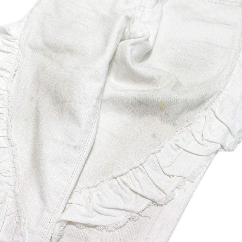 ユーズド調デニム×フリルのギャップがユニークなデニムパンツ。