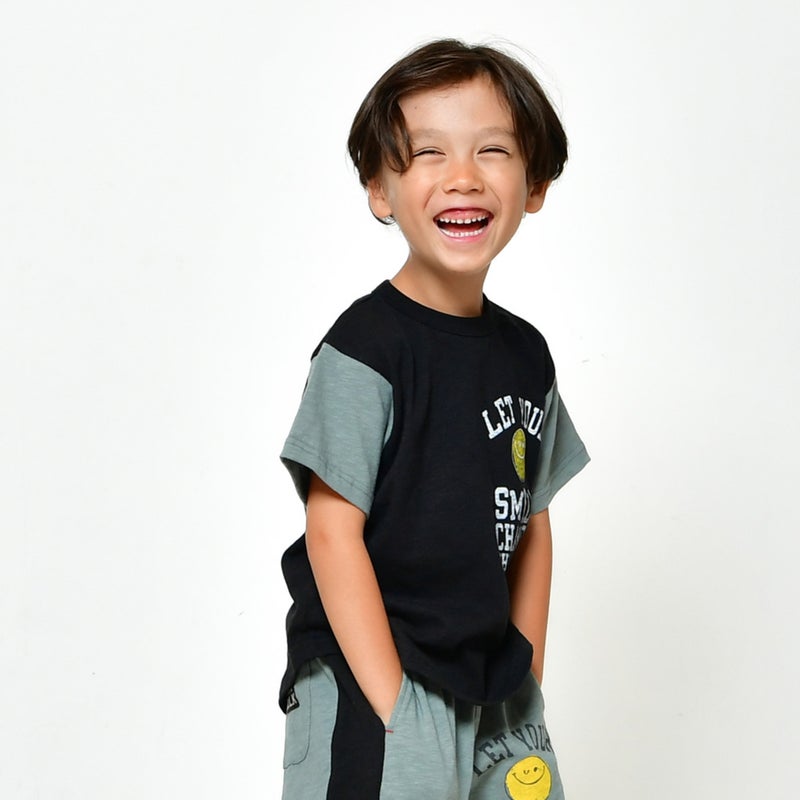 にこちゃんが目を惹くラウンドTシャツ。