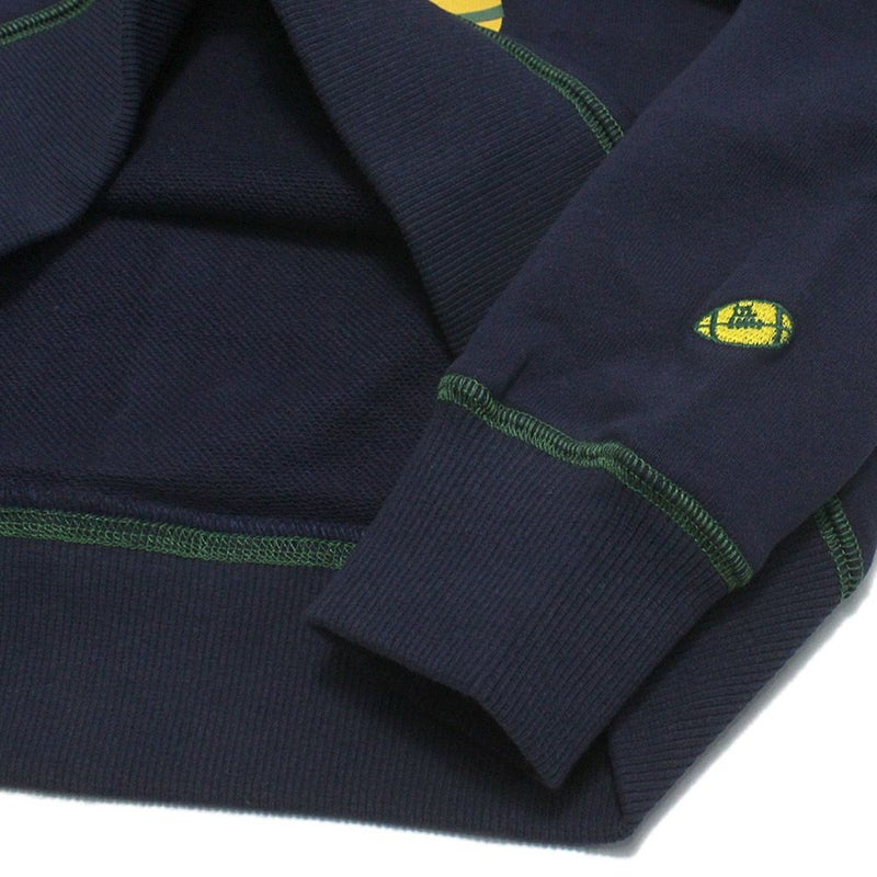 袖口のワッペンは、遊び心のあるラグビーボール。