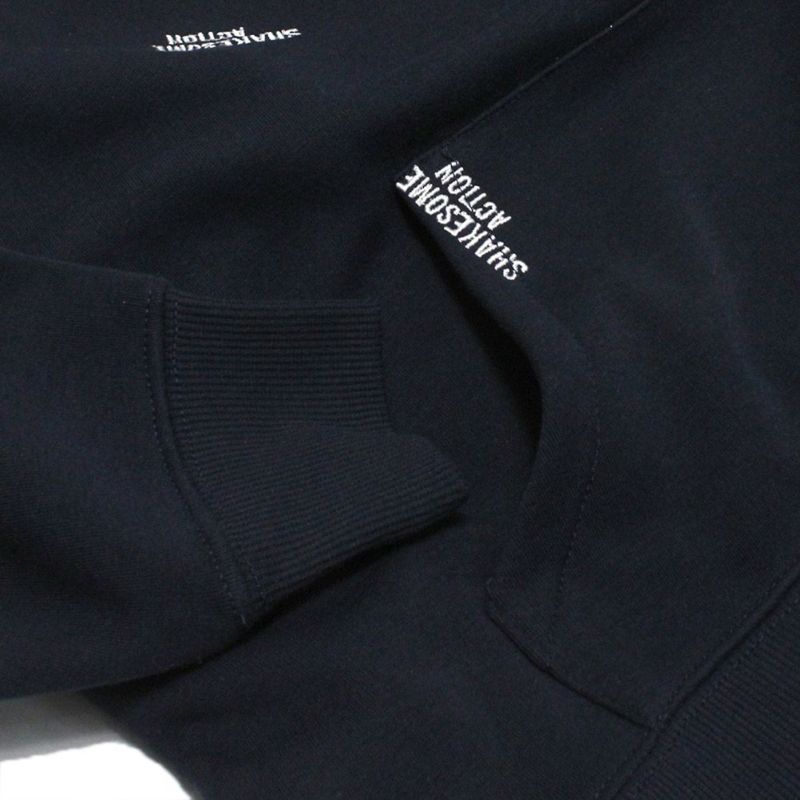クルーネックにあえてのカンガルーポケットと“SHAK SOME ACTION”の総柄刺繍が絶妙。