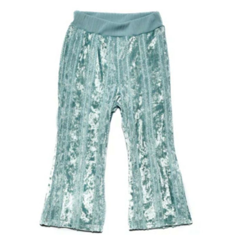 光沢感があるベロア素材のフレアパンツ。
