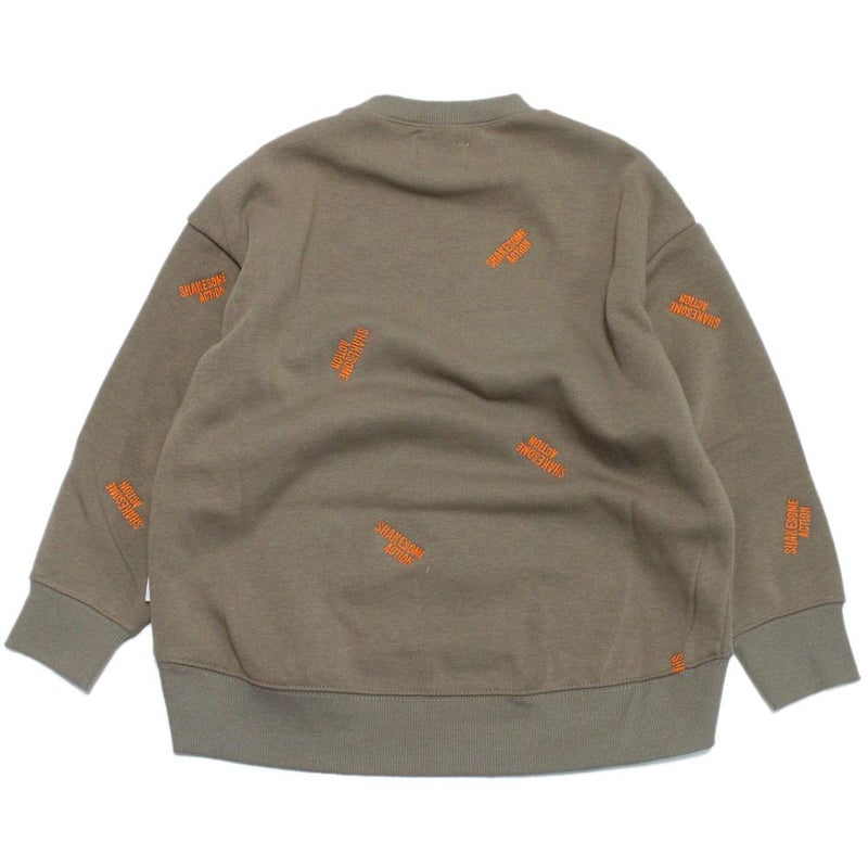 クルーネックにあえてのカンガルーポケットと“SHAK SOME ACTION”の総柄刺繍が絶妙。