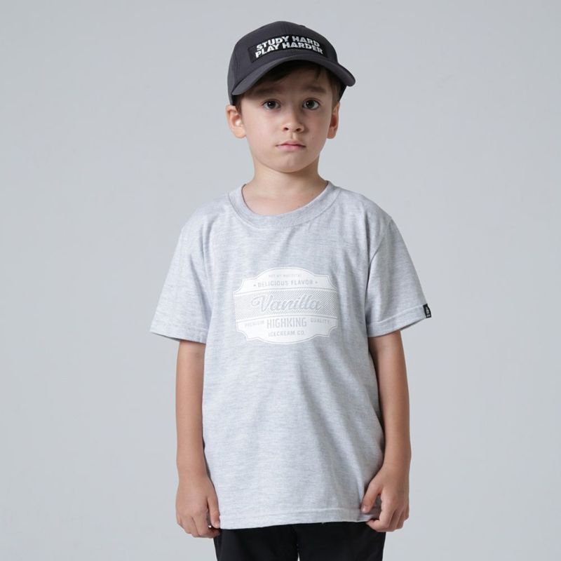 フロントに配置されたアイスクリームのラベルが遊び心のあるアクセントになっているショートスリーブ。