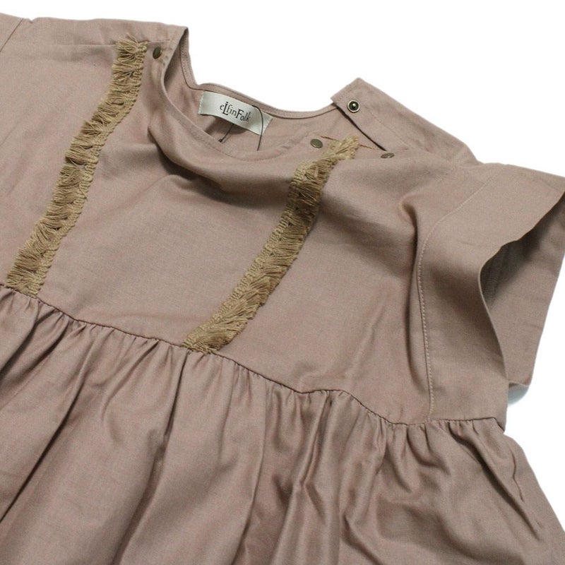 胸元の小さなフリンジとアンティークゴールドのドット釦がポイントです。